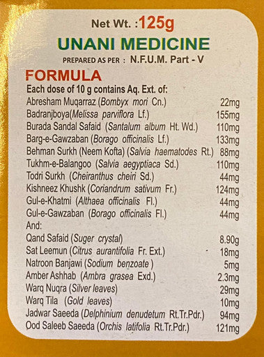 Abresham Muqarraz, Badranjboya, Burada Sandal Safaid, Berg Gaozaban, Behman Surkh, Tukhm Balangoo, Tudri Surkh, Kishneez Khushk, Gul Khatmi, Gul Gaozaban, Shakar Safaid, Sat Leemun, Natroon Banjawi, Ambar ashbab, War-e-Nuqra, Warq-e-Tila, Jadwai Saeeda, Oood Saleeb Saeeda.